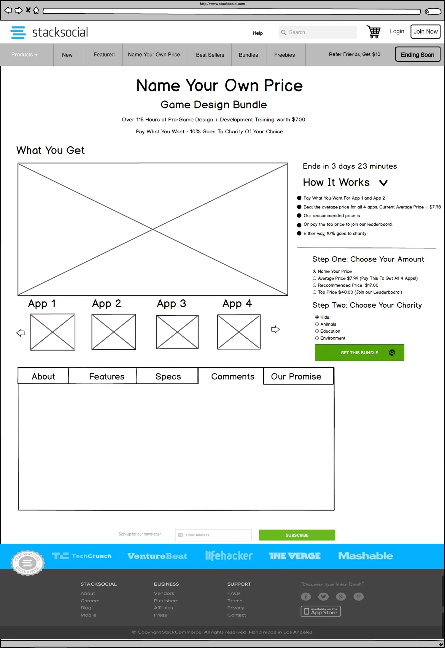We used research collected through interviews, contextual inquiries, and user testing to inform redesign of sale pages. We redesigned their "Solo" product page, "Big Bundle" product page, and their "Name Your Own Price" sale page.