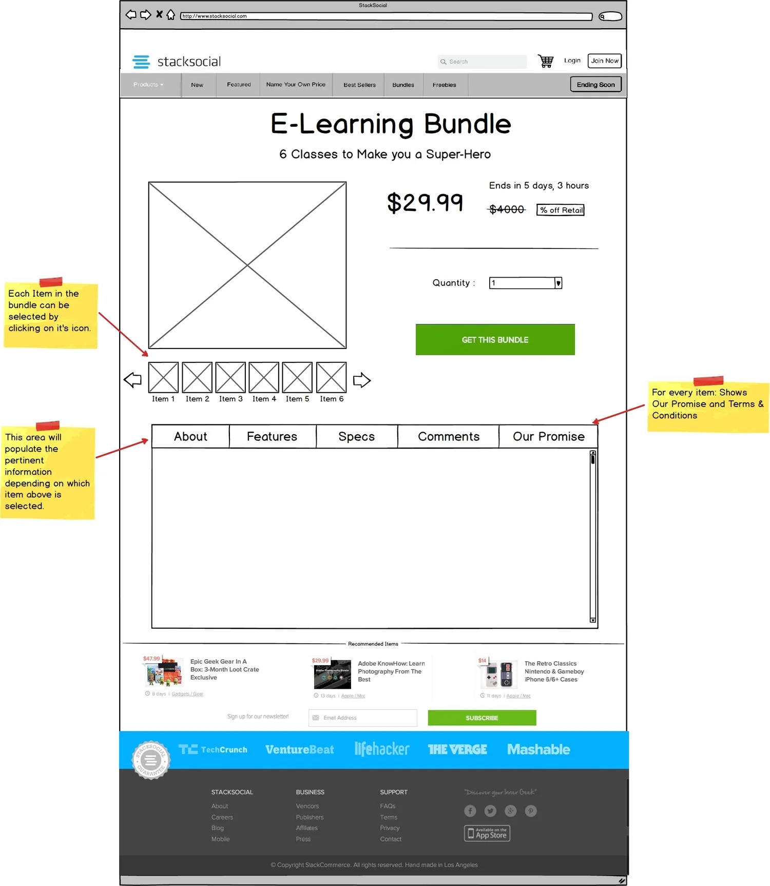 We gathered qualitative data by testing users (using QuickTime) within the target demographic and observing how they interacted with the old StackSocial product pages. Below are a few notes.